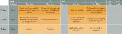 Neben der Vermittlung fachdidaktisch-methodischer Kompetenzen in den verschiedenen Bildungsbereichen liegt das Augenmerk der Modulgruppe 3 auf dem Konzept ganzheitlicher Bildung von Kindern. Die Studierenden lernen, ganzheitliche Bildungsprogramme zu entwickeln und in den Einrichtungen der BEK umzusetzen. Auch die Möglichkeiten und Formen der Elternarbeit spielen in dieser Modulgruppe eine wichtige Rolle.